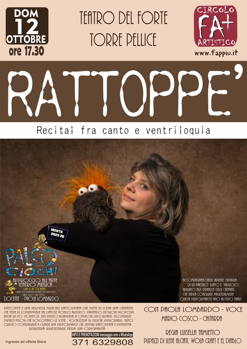 ------------------------------------------------------------------------------------------------------------------------------------------------------------------------------------------------------------------------------------------- LE NOSTRE ATTIVITA' : PALCO GIOCHI al Teatro del Forte di Torre Pellice, dal 2012, i pomeriggi artistici di spettacolo e gioco per bimbi e famiglie, ormai un appuntamento tradizionale nei pomeriggi domenicali invernali, momenti di spettacolo gestiti dal Circolo Artistico FA+ . Cartellone di artisti e di momenti condivisi di gioco con i nostri piccoli, giocolieri maghi e musicisti tutti per noi sul palco del Teatro del Forte a Torre Pellice. ......................................................................................................................................... "Femmina Fluens " 2025-26 Teatro del Forte di Torre Pellice "Femmina Fluens" , è il cartellone artistico messo in piedi dal Circolo Artistico FA+ congiuntamente all'assessorato alla cultura del Comune di Torre Pellice . La rassegna è già al decimo anno di vita e vuole trattare i diversi temi attuali, quali migrazioni, le lotte di resistenza di ieri e di oggi, la guerra e la Pace, il tutto visto dalla donna nel suo FLUIRE, nel suo modificarsi, nei suoi cambiamenti. Musica, Teatro e Cinema PROSSIMO APPUNTAMENTO: presso il Teatro del Forte di Torre Pellice 22 novembre PER INFO E PRENOTAZIONI 371 6329808 --------------------------------------------------------------------------------------------------------- il Circolo Artistico Fa+ in collaborazione con l'Unione Montana del Pinerolese e Unione Montana delle Valli Chisone e Germanasca